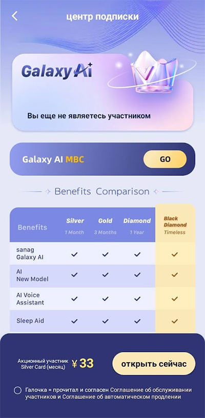 По поводу этого встроенного AI, который, как обещают разработчики, много чего умеет, включая перевод "на лету". В реальности от этого помощника толку - ноль, потому что он говорит на китайском. На вызов "Сайна Сайна" он что-то отвечает по-китайски мелодичным женским голосом, но не успеваете вы этим насладиться, как в приложении появляется приглашение оформить членство для использования этого AI без ограничений, а стартовая подписка стоит 33 юаня (4 евро), так что мне пришлось отказаться - разумеется, со всем уважением.