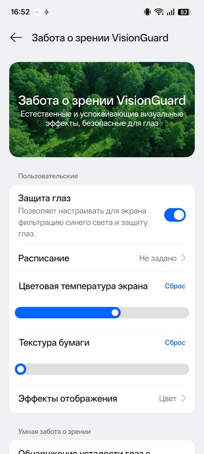 В настройках экрана есть темный режим, режим чтения, можно настраивать размер шрифта и масштаб. Частота обновления может подбираться автоматически, а может задаваться вручную.