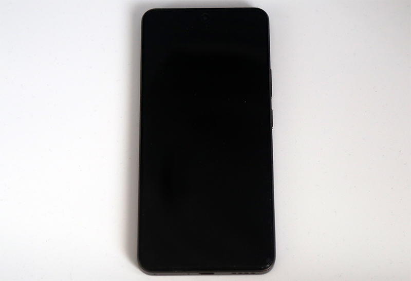 Лицевая сторона. Смартфон покрыт стеклом 2.5D, имеющим небольшие скосы по всем четырем сторонам. Рама смартфона выполнена из пластика, боковые грани совершенно прямые.