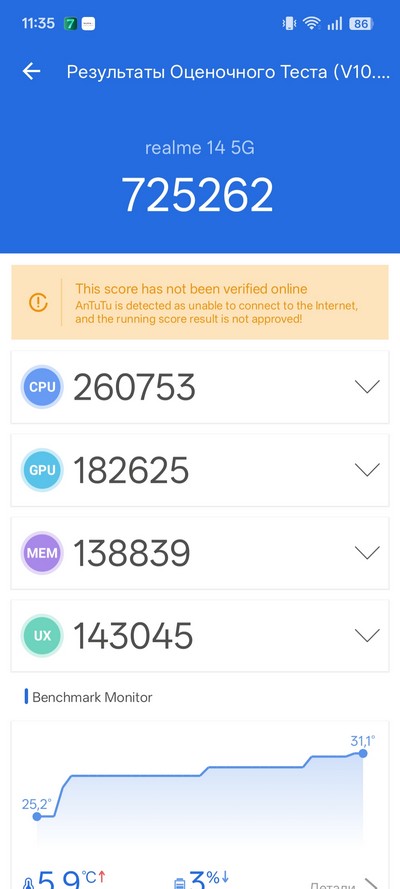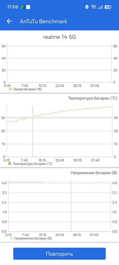 Стресс-тест AnTuTu. Производительность вообще не падала, нагрев батареи не превысил 40 градусов.