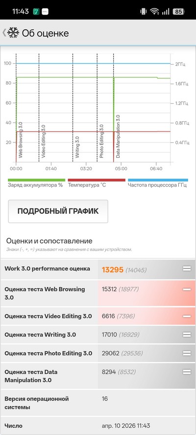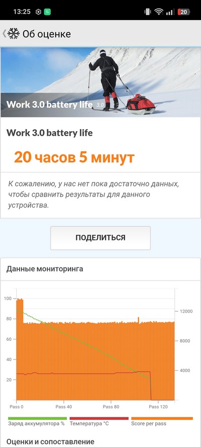 Синтетический тест PCMark. Очень крутой показатель, он означает, что при серьезной нагрузке смартфон продержится полтора дня, не меньше.