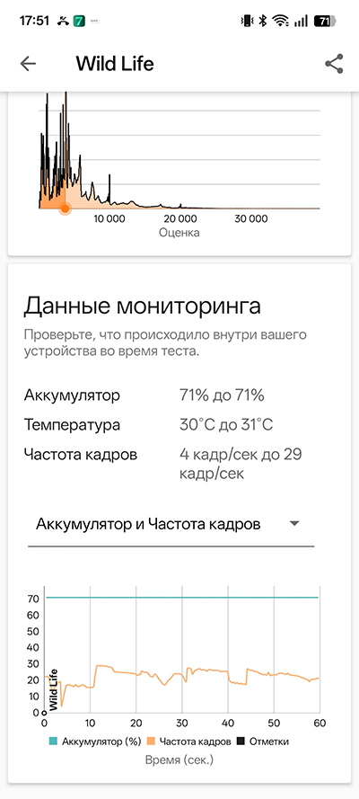 Тест на троттлинг. Падения производительности практически нет вообще. А, кстати, процессор Qualcomm Snapdragon 6 Gen 4 в других смартфонах имел проблемы с нагревом, и там троттлинг наблюдался - производителю приходилось устанавливать ограничения для процессора. Но здесь, как я читал, установлена эффективная испарительная камера, которую раньше ставили вообще только во флагманы, так что и нагрева заметного нет, и производительность не падает.