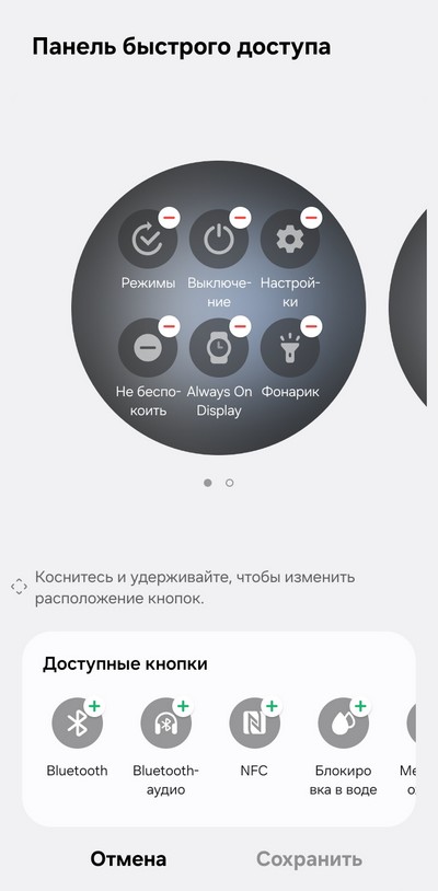 Свайп от циферблата вниз - - панель быстрого доступа: выбор режима (сон, театр), выключение, настройки, отключение любых уведомлений, режим AOD , отключение звука/вибрации, фонарик, яркость экрана, включение энергосбережения, громкость, Wi-Fi, самолетный режим, подключение наушников, поиск смартфона и так далее. Быстрые переключатели - их количество и порядок следования - можно настраивать.