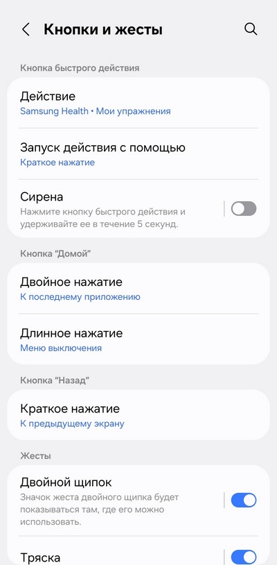Настройки кнопок и жестов. На двойное нажатие верхней кнопки можно навесить вызов любого приложения.