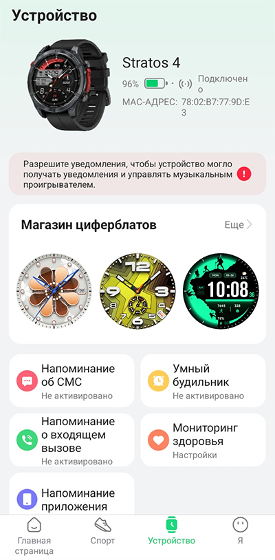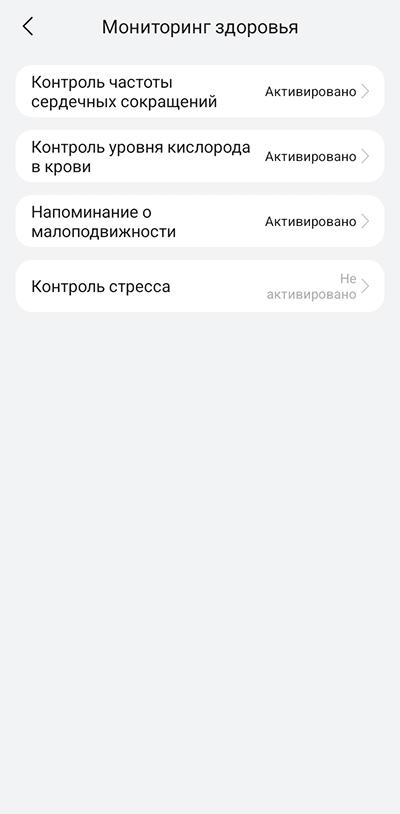 Настройки мониторинга здоровья, настройки устройства.