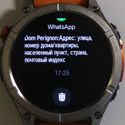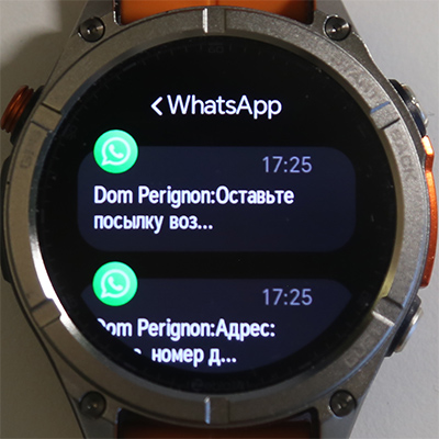 Свайп от циферблата вправо - список полученных сообщений, чтение отдельного сообщения. Ответить на сообщение предустановленной фразой здесь нельзя.
