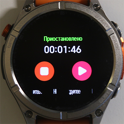 Режим отслеживания тренировки. Свайп влево - аудиоплеер, свайпы вниз - различные данные тренировки, свайп вправо - трек маршрута, кнопка слева - приостановка, завершить тренировку или продолжить. Во время тренировки никакое другое приложение вызвать нельзя.