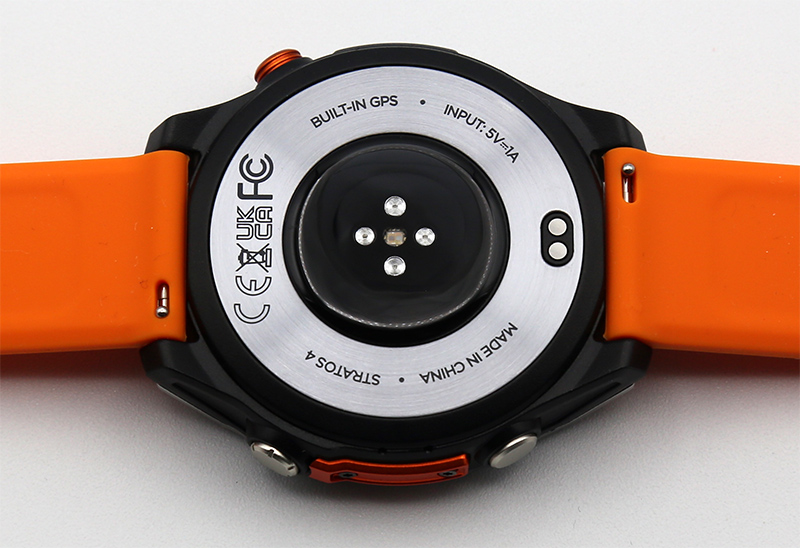 Нижняя часть - керамическое стекло, в котором расположены датчики, и металлическое кольцо, в котором размещены два контакта для зарядки. Крепление ремешка - стандартное, его можно заменить на любой ремешок 22 мм с таким же типом крепления.