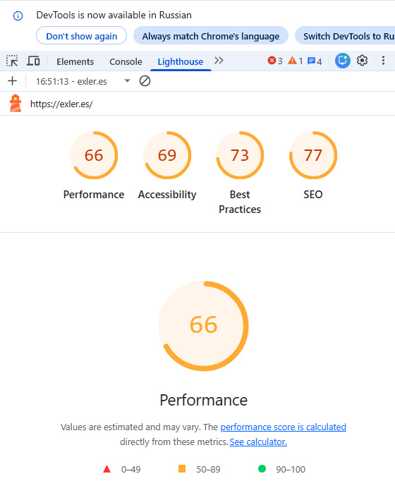Обычное подключение - анализ загрузки сайта exler.es инструментом Lighthouse в Chrome.