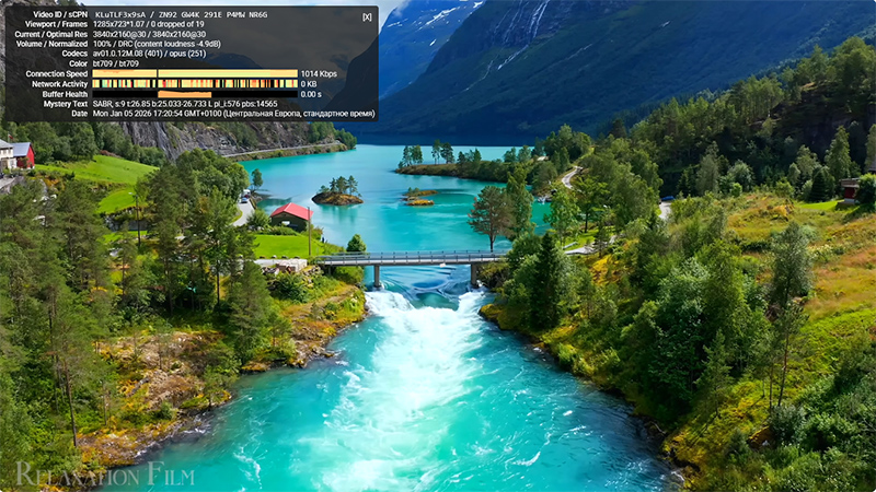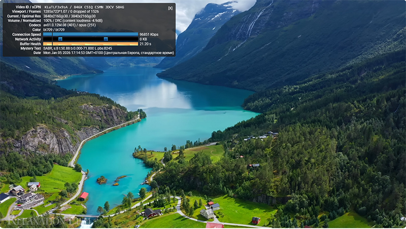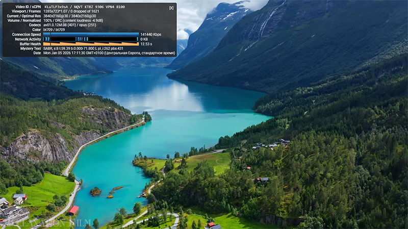 Тот же ролик через европейский сервер hidemy.name. И вот тут уже беда: 4K не идет категорически: постоянно зависает и пытается подгрузить нужный кусок, периодически YouTube сам сбрасывает качество с 4K на 720p - так хоть он более или менее показывается.