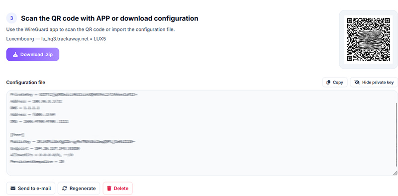 Далее в предыдущем окне нужно выбрать европейский сервер, который вы будете использовать (пока доступны серверы в Амстердаме, Люксембурге и Праге), после чего будет создан конфигурационный файл для WireGuard, который можно скопировать, чтобы вставить в приложение, скачать в виде архива или отправить на почту. Также конфигурация будет в виде QR-кода, который можно отсканировать в приложении WireGuard на смартфоне.