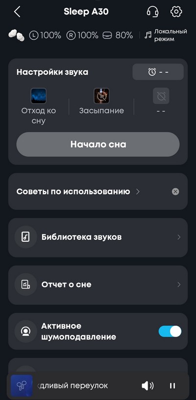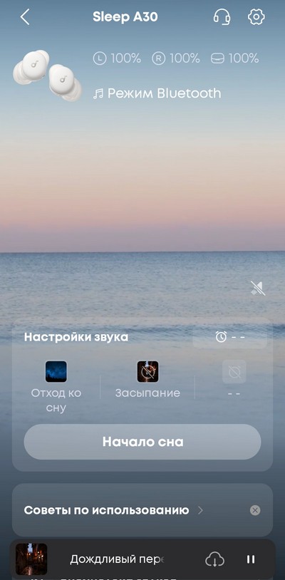 Так вот, если в режиме работы со смартфоном звук в наушниках регулировался довольно плавно, и не было никаких проблем выставить нужный уровень, то в автономном режиме звук почему-то регулировался ступенчато, и я не мог настроить нужный уровень - было или тише, чем нужно, или громче, чем нужно. В итоге я автономный режим использовал редко, а он более удобный, чем режим подключения к смартфону, тем более что я для засыпания всегда ставил один и тот же аудиотрек - шум дождя (в терминах фирменного приложения этот трек называется "Дождливый переулок").