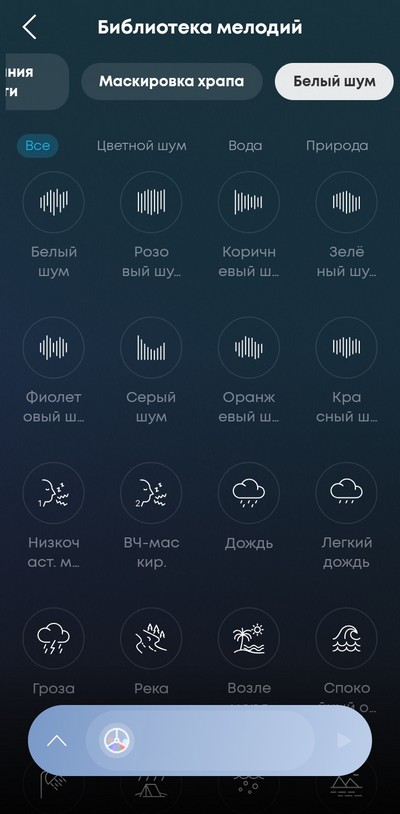 Для режима Bluetooth тут доступна большая библиотека мелодий разных направлений. "Маскировка храпа" - это специальный аудиотрек, который вместе с шумодавом помогает маскировать храп человека, спящего в той же комнате.
