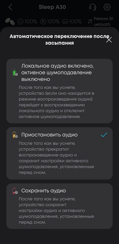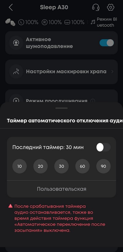 Настройки маскировки храпа. Замечу, что храп рядом определяют не наушники, а зарядный кейс, после чего приложение в наушниках включает специальный режим маскировки.