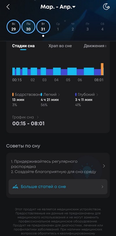 Сравнил показания сна с моими часами Huawei Watch FIT 4 Pro. Там заметное расхождение с продолжительностью быстрого и глубокого сна. Кому верить - непонятно. Ну, хоть общую продолжительность более или менее похоже определили - уже спасибо, тем более что тут тот самый редкий случай, когда удалось выспаться.