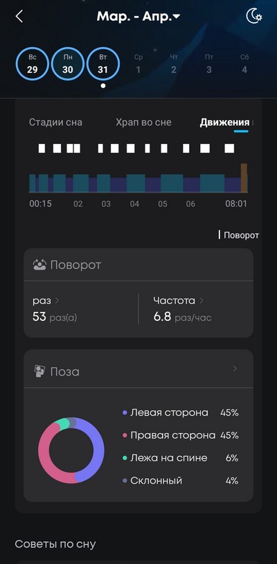 Заметьте, что они даже повороты фиксируют. Ну как - фиксируют... Врут при этом конкретно. Я уже год как сплю только на правой стороне - у меня травма левого плеча, и я перестал спать на левом боку. И если я во сне переворачиваюсь на левый бок, то просыпаюсь. Поэтому я переучился и теперь сплю только на правом боку. А эти наушники определили, что я поровну спал на правой и на левой стороне - вранье. Вот лежа на спине - да, на спину я изредка поворачиваюсь ненадолго, тут не наврали.