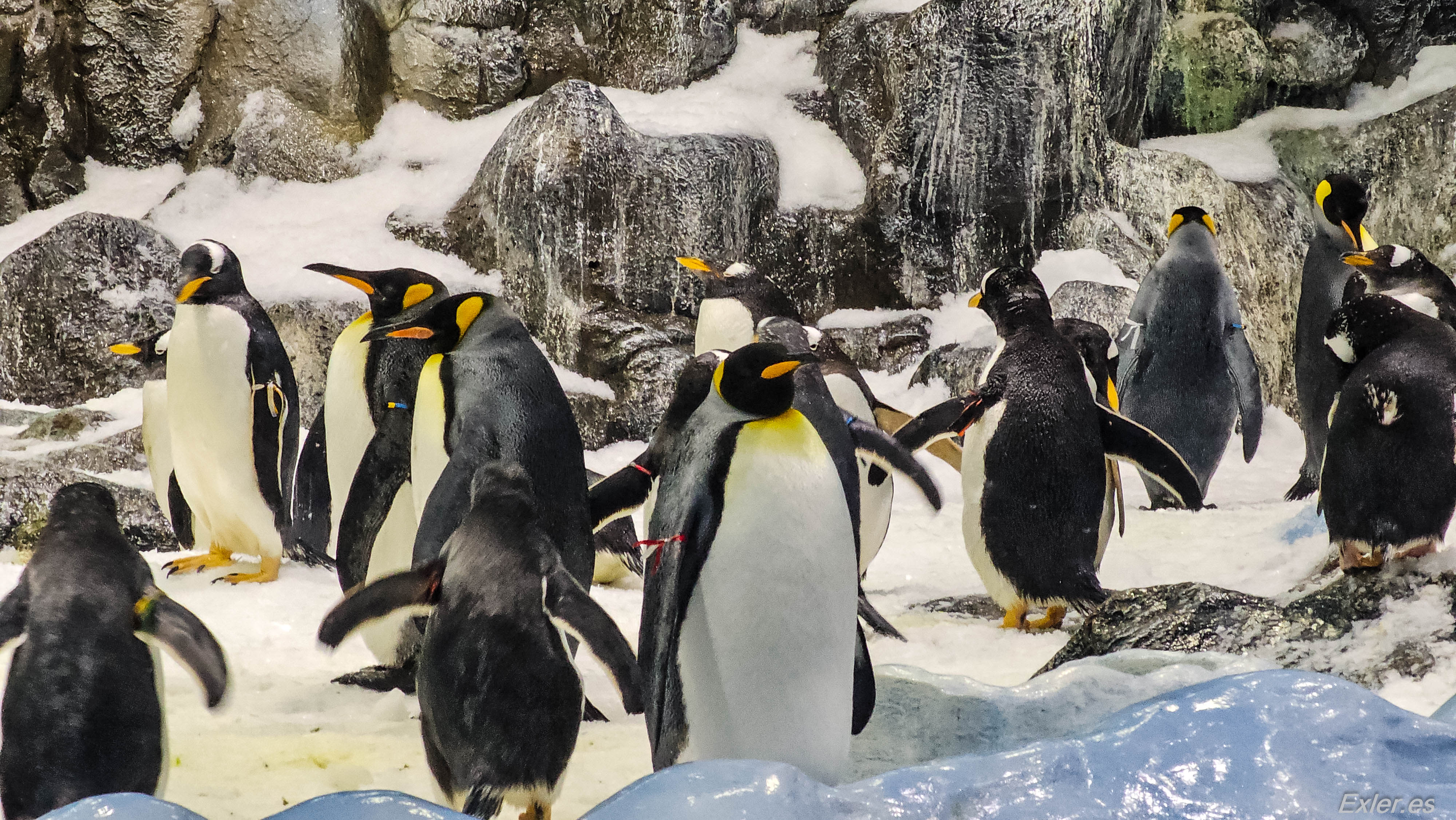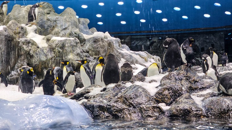 А это уже уголок пингвинов. Большая территория с бассейном и снегом (с помощью снеговых пушек пингвинам периодически устраивают настоящие метели).