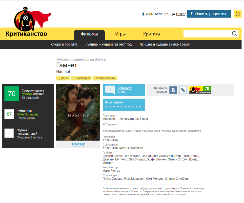 Фильм "Земля кочевников" Хлои Чжао мне очень понравился, актрису Джесси Бакли я помнил по фильму "Злобные маленькие письма", где она сыграла отлично, так что, в общем, я был настроен к картине очень благожелательно. К тому же там обещали показать влюбленного Шекспира и рассказать, чем он вдохновлялся при создании одного из самых своих известных произведений о Хэмлете (в РФ его почему-то называют Гамлетом), принце датском, задававшемся вопросом - быть или не быть, ну и все такое.