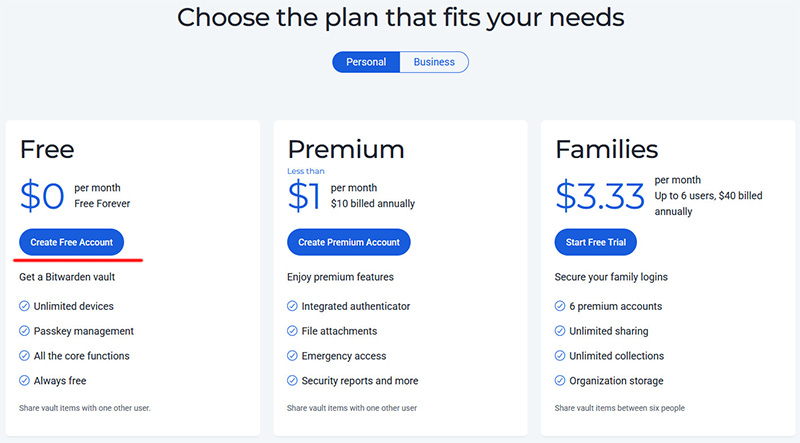 Чтобы начать пользоваться Bitwarden, нужно нажать кнопку "Get Started Free".  В появившемся окне нажать на закладку "Personal", чтобы получить персональные тарифные планы (по умолчанию там активирована закладка "Business"), и там выбрать тарифный план Free, где нужно нажать "Create Free Account".