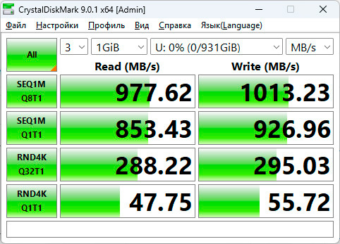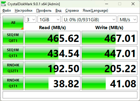 Через USB-A 3.0 скорости ожидаемо ниже, но тоже достаточно шустро.