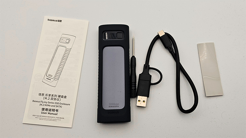 У этого корпуса в комплекте: универсальный кабель USB-A (Type-C) - Type-C, отвертка для откручивания нижней крышки, резиновый чехол на корпус, силиконовая прокладка на SSD для отвода тепла, руководство пользователя.
