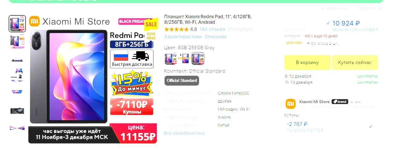 Планшет Xiaomi Redmi Pad, глобальная версия, 4/128 ГБ по выгодной цене 9 033 руб. с купоном продавца на AliExpress. А 8/256 Гб 10 924 руб