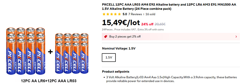 Покупаю я обычно батарейки Pkcell (их фирменный магазин на Aliexpress) - они себя хорошо зарекомендовали. И покупаю я батарейки двух типов: совсем дешевые цинк-углеродные (солевые) - для всяких пультов, часов и так далее, и более дорогие алкалиновые (щелочные) для устройств, которые имеют большее энергопотребление, но они и в два раза дороже