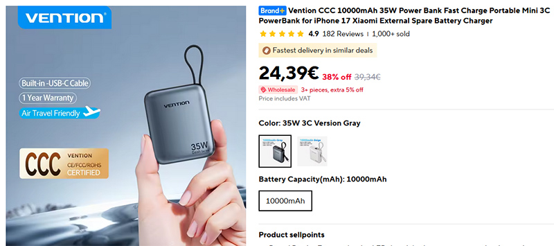 Недорогой, компактный и легкий внешний аккумулятор Vention емкостью 10000 мАч и мощностью 35 Вт. Встроенный кабель Type-C, еще один порт Type-C, дисплей, который показывает оставшийся процент заряда. Поддержка PD и PPS, сам аккумулятор заряжается на мощности 20 Вт. Более 1000 продаж со средней оценкой 4,9.