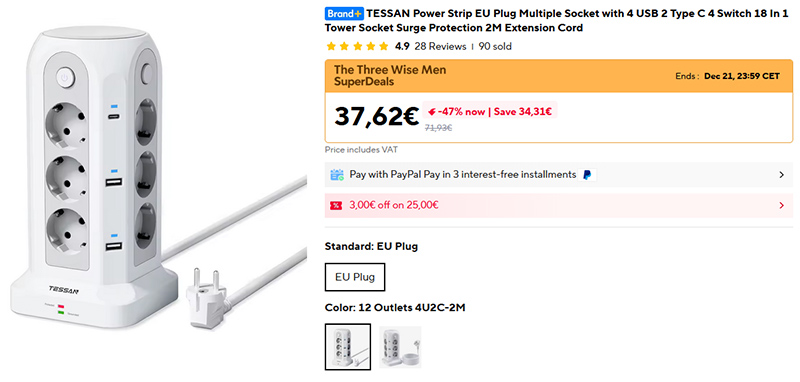 Если нужно много розеток, но чтобы устройство было достаточно компактным - вот хороший вариант: удлинитель Tessan "18 в 1": 12 европейских розеток, 4 порта USB-A, 2 порта Type-C. Каждый блок - со своей кнопкой включения/включения. Есть версия с 2-метровым кабелем, есть версия с 5-метровым кабелем.