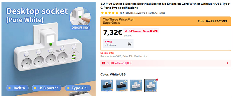 Если же нужен не удлинитель с розетками, а разветвитель в розетку, то вот хороший вариант: четыре розетки, два порта USB-A и один Type-C. Есть версия с пятью розетками. Есть общий выключатель, есть выключатель для каждой розетки. Ну и все это также есть в черном варианте.