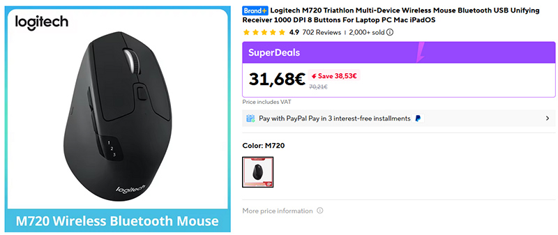 На Ali сейчас можно купить хорошую мышку Logitech M720 за 32 евро. На Амазоне она стоит 45 евро. У нее два варианта подключения - через донгл и по Bluetooth, 8 настраиваемых клавиш, разрешение 1000 DPI, а кроме того, она поддерживает подключение сразу к трем устройствам, которые можно переключать кнопками на самой мышке. У меня такое поддерживают мои клавиатура и мышь, и это прям очень удобно.