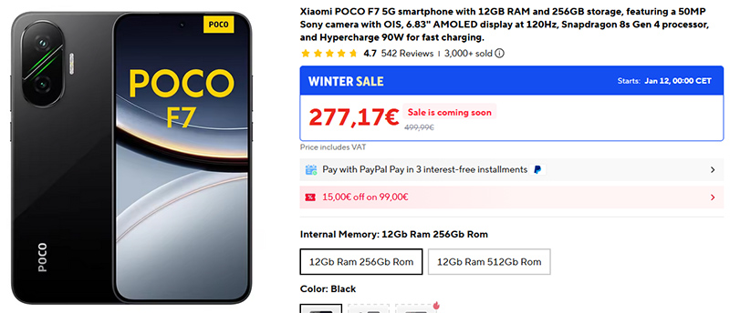 Очень хорошая цена на зимней распродаже на смартфон POCO F7 (в Амазоне эта же комплектация - €340).