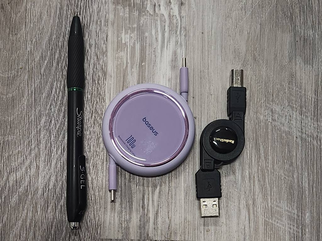 Вот фото для сравнения "обычной" голубой U-green рулетки (USB-C коннекторы, USB2.0 протокол, 4, возможно 6 проводов под оплеткой), черной 20-летней с аналогичным USB2 (4 провода) и сиреневой стоваттной с USB3 (6 или 8 проводов).