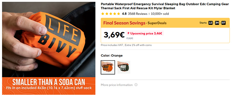 Портативный водонепроницаемый спальный мешок для выживания в чрезвычайных ситуациях. В сложенном виде он размером с банку пива. Изготовлен из сверхтолстого майлара толщиной 26 мкм, водонепроницаемый и многоразовый. В него могут залезть до двух человек. Заказал пару - кину в багажник машины. Никогда не знаешь, в каких условиях придется оказаться.