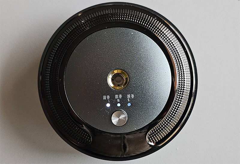 Ну и все, устройство готово к работе. Включается длинным нажатием кнопки, есть три режима работы. (Там в англоязычной инструкции подробно расписано, как работает каждый режим.) Самый удобный режим - первый, когда горит белая лампочка. В этом случае диффузор выбрасывает небольшое облачко распыленного масла каждые две минуты, а в отсутствии тряски переходит в спящий режим и активизируется только когда машина начинает двигаться. В этом же режиме устройство можно использовать и в помещении. Поставил на стол, активировал - в помещении приятно пахнет эфирным маслом. Когда нужно снова активировать заснувшее устройство, его нужно просто коснуться пальцем.
