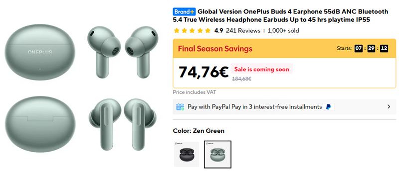 Продвинутые TWS-наушники с активным шумоподавлением OnePlus Buds 4. Поддержка кодеков SBC, AAC и LHDC 5.0, адаптивное шумоподавление до 55 дБ, Bluetooth 5.4, защита IP55, 3 микрофона на каждом наушнике, шумоподавление в режиме разговора, игровой режим, пространственный звук, AI перевод при разговоре, сенсорное и голосовое управление, мультипоинт, датчик вынимания из уха, время работы без шумодава 11 часов, с шумодавом 6 часов, общее время работы с подзарядкой от кейса - до 45 часов. В обзорах хвалят звук, отмечая хорошие басы и детализацию. Два варианта цветов.