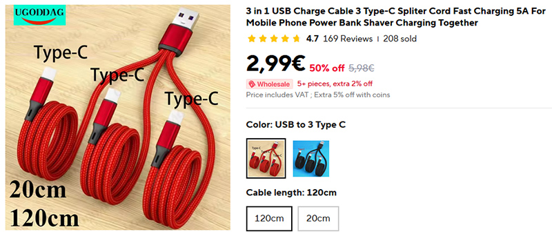 Времена зарядных кабелей "3 в 1" с головками под microUSB и Lightning уже прошли, а вот кабель с тремя головками Type-C сейчас очень даже актуален: одновременно заряжать, например, смартфон, планшет и наушники. Два вида цветов, два варианта размеров - 20 см и 120 см.