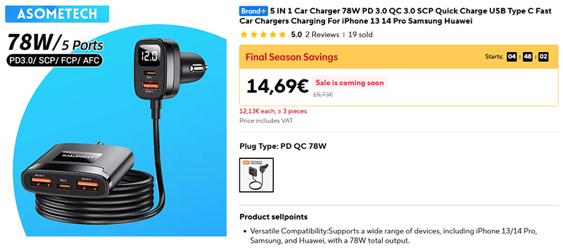 Если вы в машине часто ездите не один, и пассажирам, как и вам, нужно подзаряжать свои смартфоны - вот продвинутый зарядный адаптер Asometech аж "5 в 1" мощностью 78 Вт с удлинителем. Поддержка быстрой зарядки PD 3.0 QC 3.0 SCP, три порта USB-A мощностью 30, 30 и 18 Вт, два порта Type-C мощностью 30 Вт. Зарядит, короче говоря, всё и даже больше. Плюс есть дисплей, на котором показывается вольтаж зарядки.