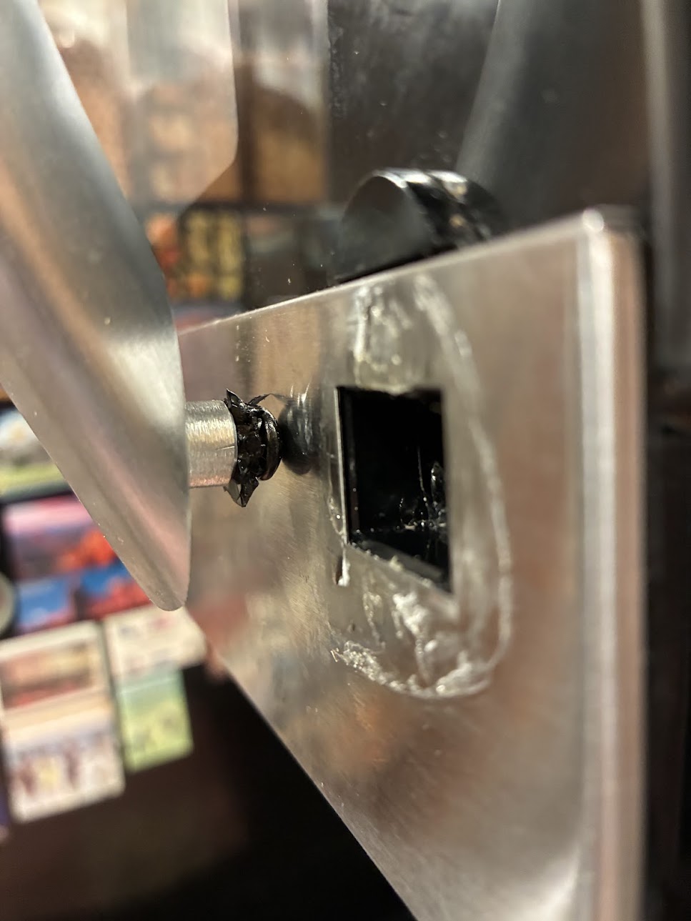 У нижнего конца ручки отломалось изнутри какой-то пластик который держал винт который держал ручку - видно на третей фотке отломанный винт.