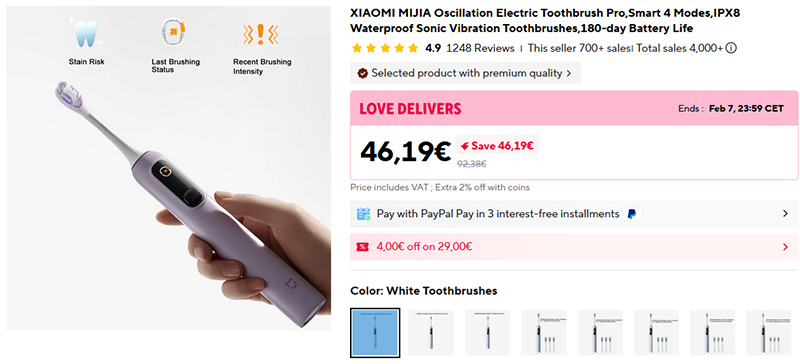 Интеллектуальный дисплей: отображает продолжительность чистки в режиме реального времени, очищенные участки и оставшийся заряд батареи. Заряжается через порт Type-C. Различные варианты цветов, есть комплектации с запасными головками. Более 4000 продаж, средняя оценка 4,9.