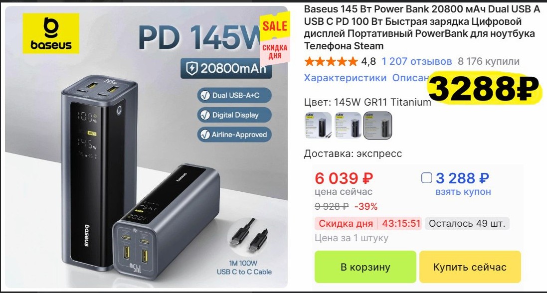Повербанк имеет ёмкость 20800 мАч, LED-дисплей с указанием характеристик зарядки и остатка батареи, 2 Type-C и 2 USB-порта. Подойдёт для питания ноутбуков. На выбор несколько цветов.