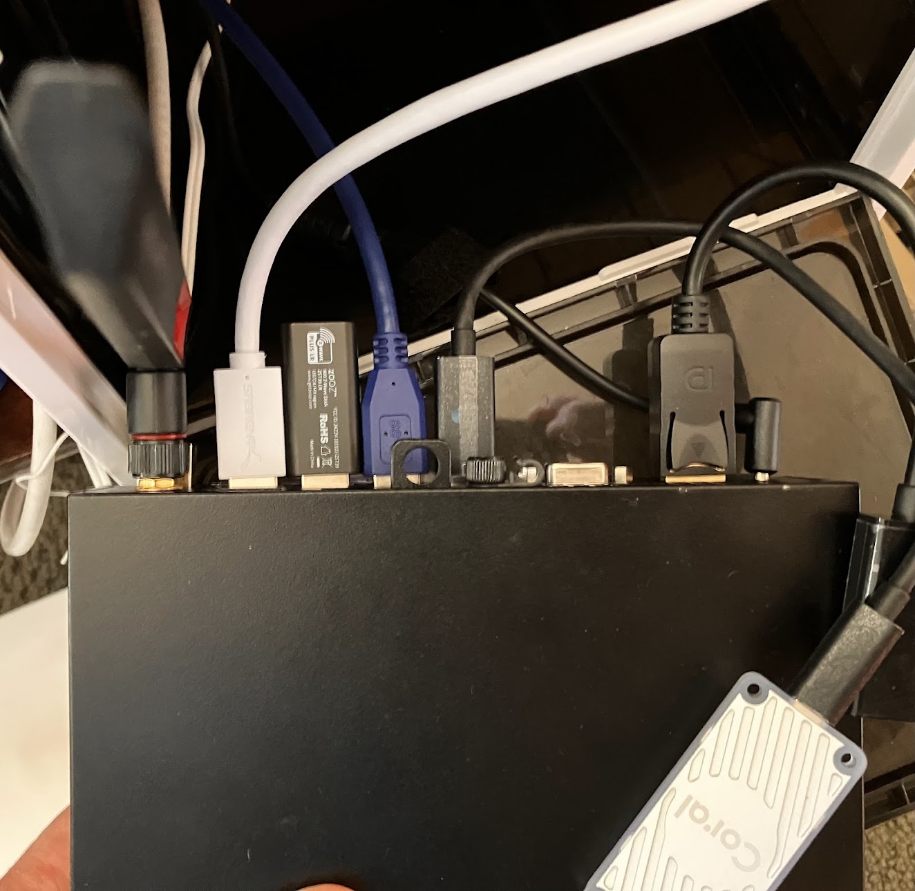 Вот, оно в работе - слева направо - wifi (не используется), под ним - ethernet на гиг (подключается к свитчу linksys 1950 на котором бежит DD-WRT), потом четыре USB порта - Sonoff Zigbee adapter (через USB удлинитель белого цвета), Z-wave Series 800 long range adapter, RTL-SDR через USB удлинитель синего цвета, Google Coral USB.
