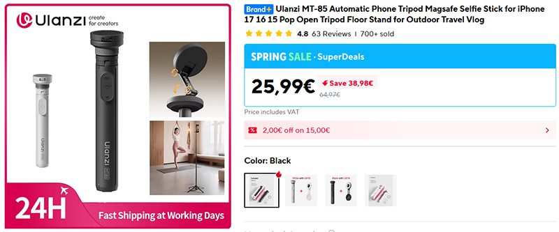 Селфи-палка он же штатив с четырьмя ножками с магнитным держателем MagSafe, есть пульт удаленного управления, работающий по Bluetooth.