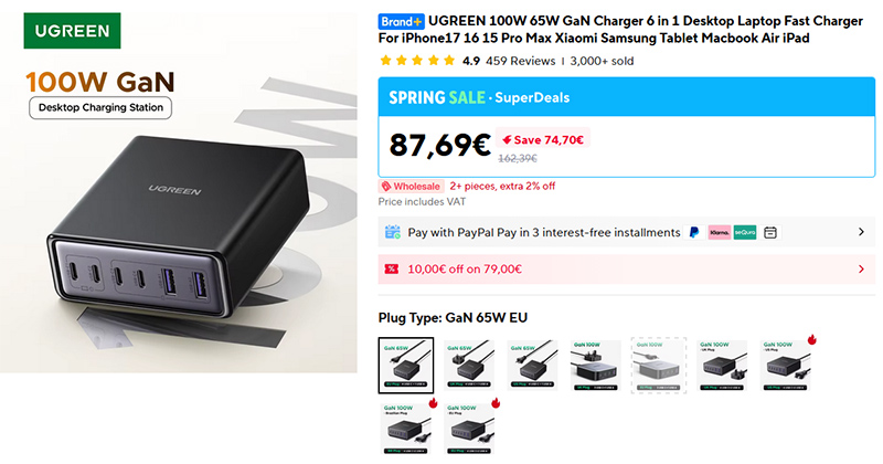 Мощный настольный GaN-адаптер UGREEN: 6 портов (два USB-A, четыре Type-C), общая мощность 100 Вт, мощность порта для питания ноутбука - 65 Вт. Адаптер подключается к розетке двухметровым кабелем.