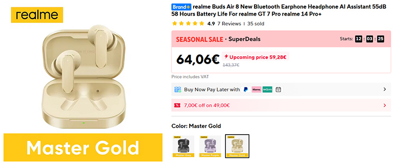 Продвинутые TWS-наушники Realme Buds Air 8. Двухдрайверная схема (11 мм динамический басовый драйвер + 6 мм планарный твитер для более детальных высоких частот), поддержка LHDC 5.0, а также AAC и SBC; звучание с акцентом на глубокий бас, но с достаточно чистыми серединами и высокими. Активное щумоподавление до 55 дБ, адаптивное (несколько уровней + прозрачный режим). Микрофоны и звонки: 6 микрофонов (по 3 на каждый наушник) с AI-обработкой Автономность: до 14 часов от самих наушников (без ANC) и до 58 часов вместе с кейсом (ANC выкл), около 30 часов с ANC; 10 минут зарядки дают примерно до 11 часов прослушивания (с кейсом). Поддержка Bluetooth 5.4, одновременное подключение к 3 (!) устройствам. Фишки ИИ: AI Voice Assistant 2.0, Live/Face-to-face переводчик. Три варианта цветов.