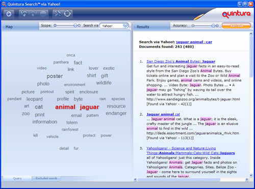 Основная особенность Quintura - быстрое и легко визуально воспринимаемое уточнение того, что же, собственно, вы собираетесь найти. Ведь если вы, например, задаете для поиска слово "ягуар", то ни одна поисковая система сразу не поймет, имеете вы в виду марку машины или породу животного. А Quintura в процессе поиска будет производить необходимые уточнения, чтобы вы как можно быстрее нашли именно то, что вам нужно.