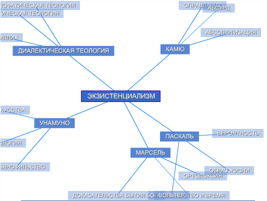 Например, интересует вас, что означает такой сложный и трудновыговариваемый термин, как экзистенциализм. Нет проблем, заходите в философию и в разделе на букву "Э" находите требуемое толкование. Под ним располагается картинка с древовидной трехуровневой структурой, в которой можно мышкой двигать туда-сюда разные термины со всеми веточками, если они друг на друга накладываются, где визуально демонстрируются взаимосвязи "экзистенциализма" с другими определениями словарика. Выглядит это так: