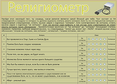 Забавный тест - "Религиометр". Нужно выбрать уровень согласия или несогласия со всеми предлагаемыми 54 утверждениями, в результате чего вам скажут, какая из религий подходит вам больше всего. У меня по результатам теста получилось следующее:
