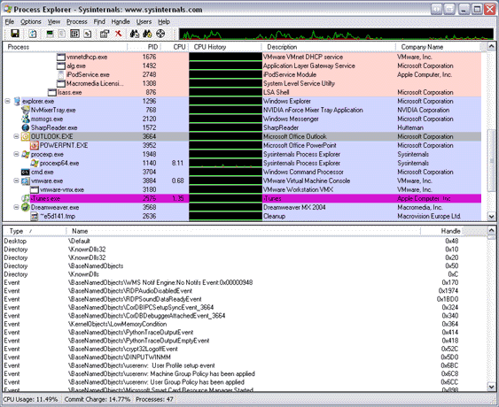 Программка ProcessExplorer, которая может как работать самостоятельно, так и заменять стандартный диспетчер задач Windows, значительно расширяя его функциональность. Freeware. Ссылки на скачивание под разные операционные системы - внизу страницы. Выглядит запущенная программа примерно так: