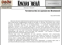 Некая Лена Воронова, употребляя сильнейшие галлюциногены, пишет статьи о том, как создавалась наша Вселенная и что в ней происходило. Сами статьи никакого интереса не представляют - мало ли какого бреда понапишут экзальтированные дамы с измененным сознанием, - однако интересно то, что этот дурдом печатают знаете где? Нет, не в "Экспресс-газете", хотя даже для нее это слишком круто. В "Красной звезде"! Чес-слово. Под эгидой, цитирую: "Лена Воронова, не навязывая свою точку зрения, лишь повествует о том, что стало ей известно благодаря ее редкому дару".